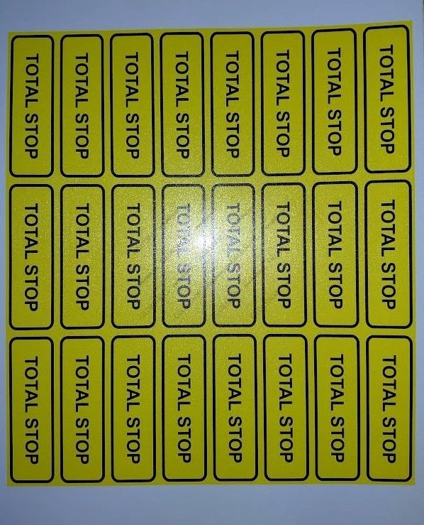 Total stop - stop tlačítko prodáváme na samolepícím archu A4 po 24 ks ve velikosti 25x75 mm nebo po 18 ks ve velikosti 100x30 mm. Kvalitní UV tisk. Bez prořezu - je nutno si je nastříhat.