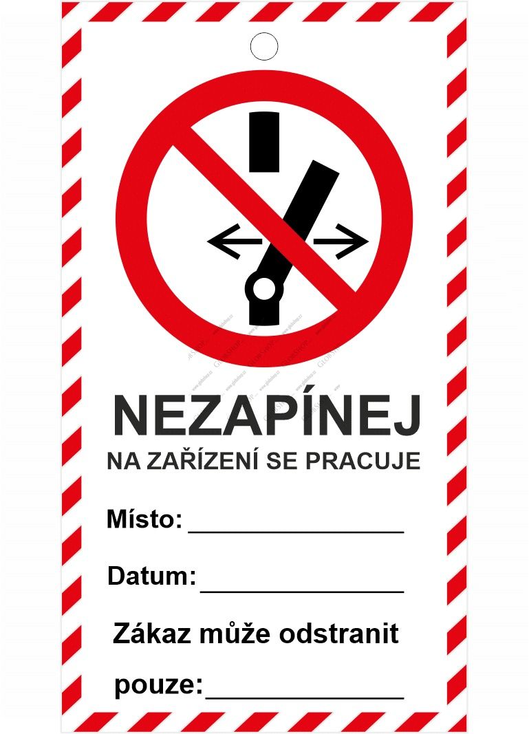 Závěsná tabulka k označení opravy a údržby stroje. Je velmi důležitá pro zachování bezpečí zaměstnanců, kteří se zařízením či strojem pracují. Štítky především informují, co za nebezpečí hrozí při manipulaci a údržbě.